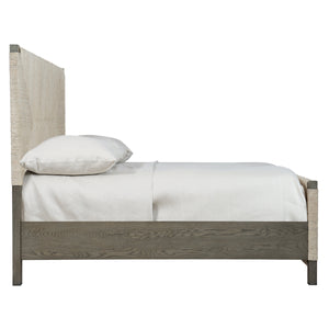 Wood-framed headboard and footboard, and wood side rails of oak solids and rustic flat cut white oak veneers.Rustic Grey finish.Woven abaca headboard and footboard panel in a light grey wash finish.Three slat support system with adjustable center supports.