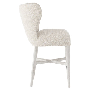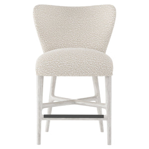 Fully upholstered curved back, and seat with welt trim.Wire-brushed wood frame and stretchers with black powder-coated metal footrest cap rail across front.Glides.
