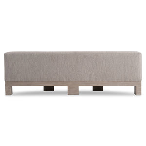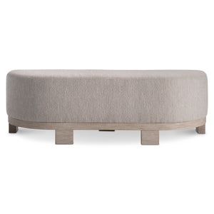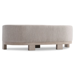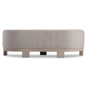 Upholstered top and sidesCurved front and endsSeven wood feet and rail in Tawny finishAdjustable glides