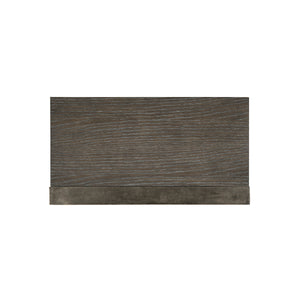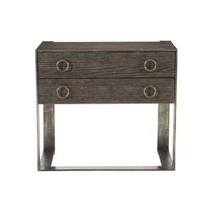 Sandblasted Oak veneers in Weathered Charcoal finish.Two drawers.Solid Aluminum frame in Graphite finish.Adjustable glides.