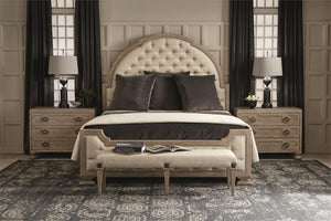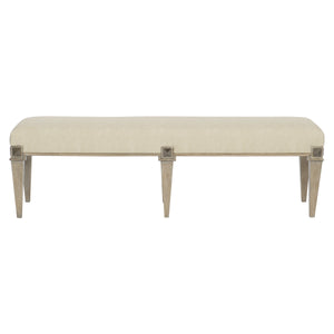 Upholstered seat in performance fabric.Six wood legs.Stainless Steel medallion at the top of each post in Vintage Nickel finish.Adjustable glides.