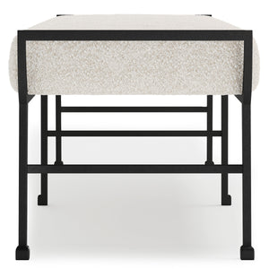 Traditional styling takes on a lifelike appearance with our Mansfield Bench. The legs and feet angle outward in a poised stance, ready to support. The padded seat is cleanly upholstered along the top and sides, accentuating the dynamic shape of the frame. This long bench provides ample seating along a wall or the foot of a bed in enduring metal construction.