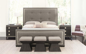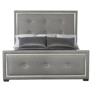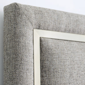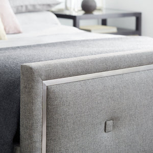 Upholstered headboard and footboard with inset Stainless Steel frame overlay inside of upholstered border in Silver Mist finish.Square fabric-covered buttons on inside front headboard panel and outside front footboard panel.Upholstered side rails.Three slat support system with center adjustable supports.