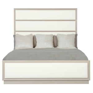 Engineered Faux Anigre veneers in Linear Gray finish.Wood-framed headboard with four upholstered, inset horizontal panels - no welt.Wood-framed footboard with upholstered panel - no welt.Wood side rails.Three slat support system with adjustable center supports.