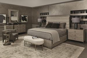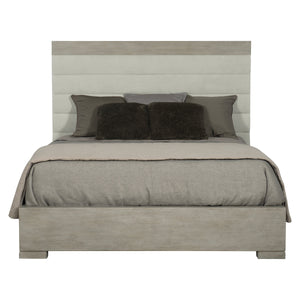 Wood-framed headboard and footboard with three inset upholstered panels.Wood side rails.Cerused Charcoal finish.Three slat support system with center adjustable supports.