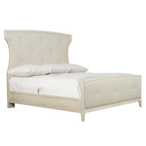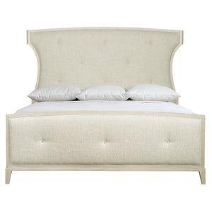 Wood-framed headboard with slightly curved ends with inset upholstered panel with button-tufting and welt.Wood-framed footboard with inset button-tufted upholstered panel with welt.Wood veneered side rails.Five wood slat support system with adjustable supports.