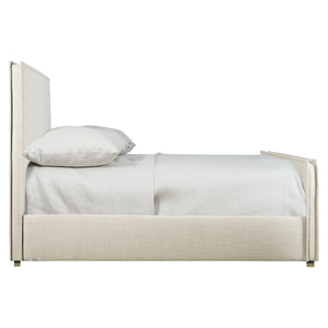 Upholstered headboard, footboard and side rails over muslin with stitched flanged edge.Headboard and footboard have flanged edges.Wood feet in Morel finish.Five wood slat support system with adjustable center supports.