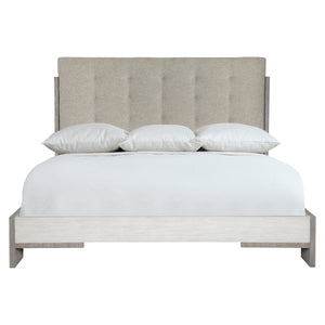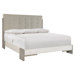 Upholstered panel with light button-tufting with support panels in Light Shale finish.Black cambric on back of headboard.Two-tone finish on footboard. Footboard in Linen finish and support rails in Light Shale finish.Two-tone finish on side rails. Side Rails in Linen finish and support panels in Light Shale finish.Adjustable glides. Four wood slat support system with adjustable supports.