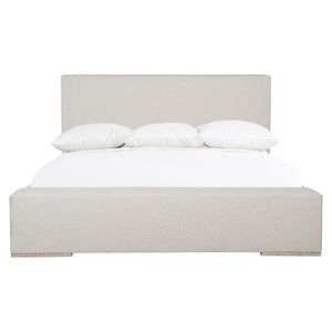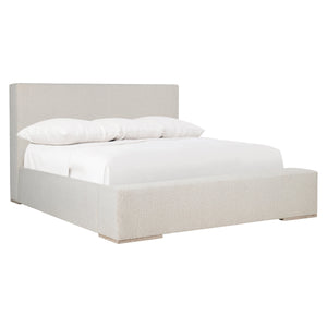 King size.Fully upholstered headboard, footboard, and side rails.Features fully upholstered, attached bench at foot of bed.Exposed white oak feet in Flaxen finish.Vandalay slat system.