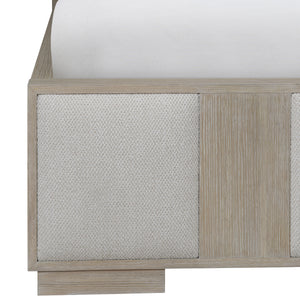 Quartered ash solids and quartered white oak veneersWood-framed headboard with two wood vertical panels in Dune finish and three inset upholstered panels in B581 fabricWood-framed footboard with two vertical wood panels and three inset upholstered panels in B581 fabricAll exposed wood in Dune finishStandard with five wood slats with adjustable double center support legs