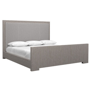 Yellow pine-framed queen panel bed with headboard in Gris finish with thick inset upholstered panel and yellow pine footboard and side rails in Gris finishTwo stitched seams on front of upholstered panelStandard with five wood slats with adjustable center support legsGlides