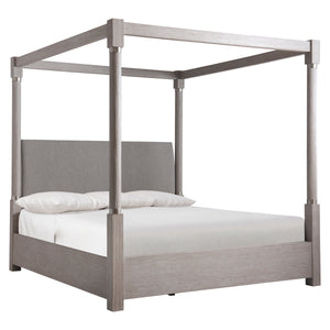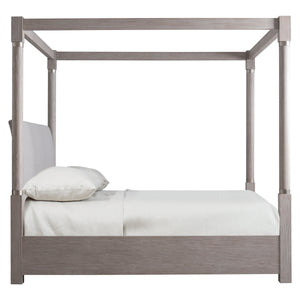 Canopy king bed with upholstered headboard and yellow pine wood posts, canopy, footboard and siderails in Gris finish and metal bands in Argent finishUpholstered headboard tilts back slightly at topHeadboard cannot be used aloneStandard with five wood slats with adjustable center support