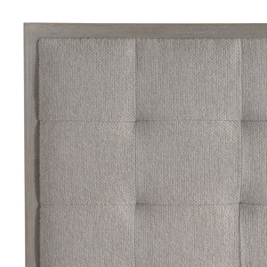 Upholstered headboard, side rails and footboard with exposed wood in Nebbia finishWood-framed upholstered headboard with buttonless tufted panelExposed wood feetAvailable in fabric B115Standard with five wood slats and wood center support legs with adjustable glides