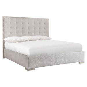 Upholstered headboard, side rails and footboard with exposed wood in Nebbia finishWood-framed upholstered headboard with buttonless tufted panelExposed wood feetAvailable in fabric B115Standard with five wood slats and wood center support legs with adjustable glides