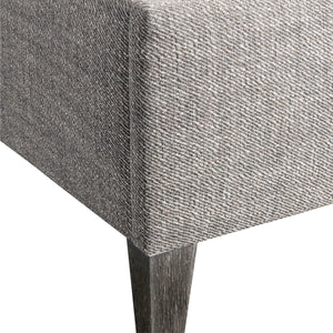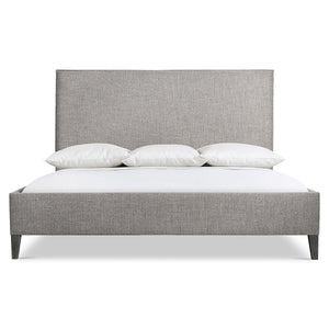 Fully upholstered headboard, footboard & side rails with exposed wood feet in Sutton finishHeadboard has butterfly flangeAvailable in fabric B145Standard with five wood slats with adjustable double center support legsTack glidesSpecifications subject to change without notice