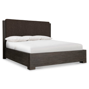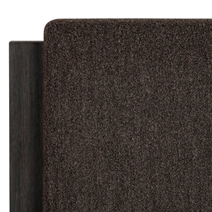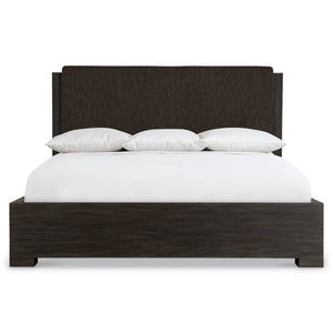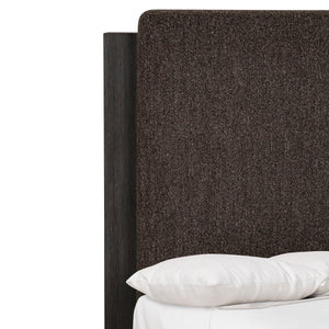 Wrap-over upholstered headboard on mahogany frame in Bracken finish with mahogany footboard and side rails in Bracken finishAvailable in select fabric optionsStandard with metal slat system: three metal support slats with three metal legsAdjustable glidesSpecifications subject to change without notice