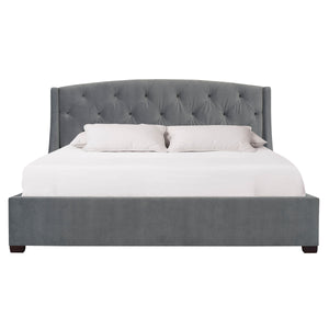 Fully upholstered, button-tufted headboard with "wings" and nailhead trim, upholstered side rails, and upholstered footboard with storage drawerWood feet available in Smoke or Espresso finishAvailable in select fabric optionsNail trim is optional but available on headboard only; no welt trim availableHeadboard cannot be used alone; must be ordered with footboard and side railsStandard with Vandalay Slat System with three metal slats and adjustable center supportSpecifications subject to change without notice