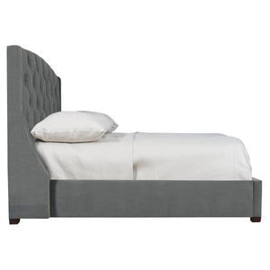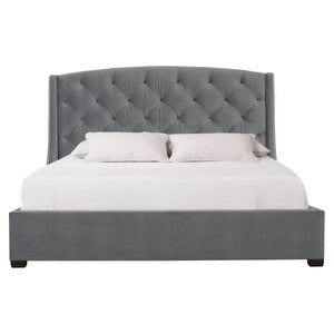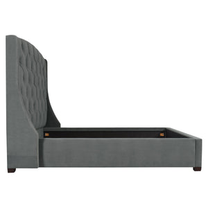 Fully upholstered, button-tufted headboard with "wings" and nail head trim, upholstered side rails, and upholstered footboard with storage drawerWood feet available in Smoke or Espresso finishAvailable in select fabric optionsNail trim is optional but available on headboard only; no welt trim availableHeadboard cannot be used alone; must be ordered with footboard and side railsStandard with Vandalay Slat System with three metal slats and adjustable center supportSpecifications subject to change without notice