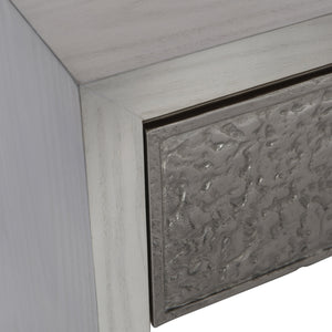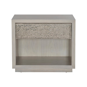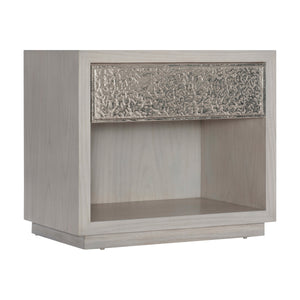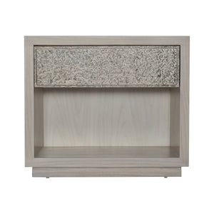 Pika finish.One drawer with textured cast aluminum drawer front and Bernhardt name plate. One open front compartment below drawer.Plinth base.Two-port USB charger on back of case.Adjustable glides and anti-tip kit with instruction sheet.