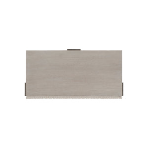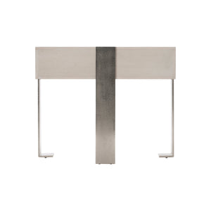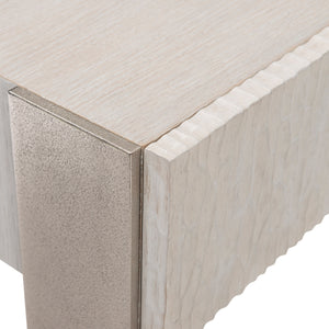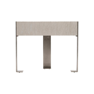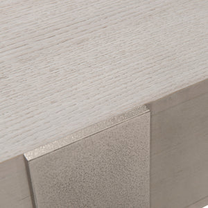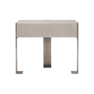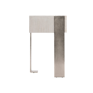 Quartered ash solids and quartered white oak veneersRectangular nightstand in Weathered Bone finish with one drawer with cast chiseled frontTwo-port USB charger located on upper back of caseThree cast aluminum metal legs in Shiny Nickel finishAdjustable glides & Anti-tip kit