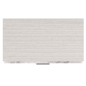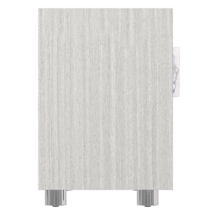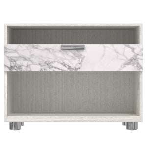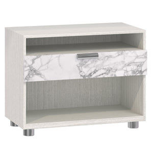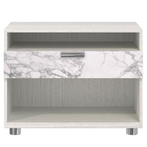 Ash solids and engineered veneer in Mist finishFixed shelf open compartments above and below one soft-close drawer with front of Arabescato stoneMetal drawer pull and feet in Polished Nickel finishTwo-port USB charging unit on upper back panelAnti-tip kit