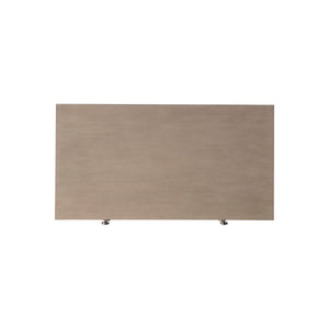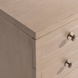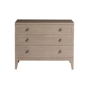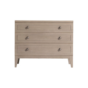 Ash wood in Nebbia finish with metal accents in Brushed Stainless Steel finish and drawer pulls in Glazed Stainless Steel finishThree pull-to-open, soft-close drawers, each with metal inlay in Brushed Stainless Steel finishTwo-port A+C USB charging unit on back of caseAdjustable glidesAnti-tip kit