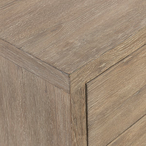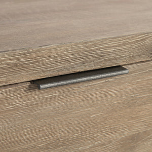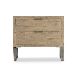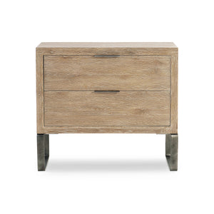 White oak solids and veneers in Aurum finish on two textured steel sled bases in Barlow finishTwo soft-close drawers with steel tab pulls in Barlow finishTwo-port A+C USB charging unitAdjustable glidesAnti-tip kit