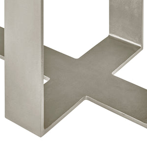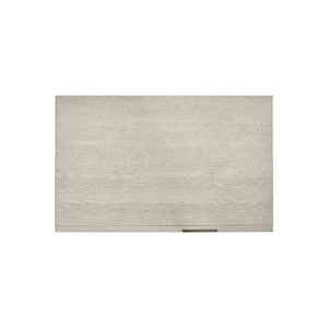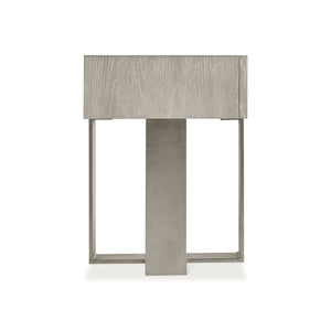 Wirebrushed oak drawer box in Larza finish and open sandblasted aluminum base in Satin Nickel finishFront accent aluminum post on front-facing right sideOne pull-to-open, soft-close drawer with finger pullTwo-port A+C USB Charging unitAdjustable glidesAnti-tip kitNot suitable for use with TVSpecifications subject to change without notice
