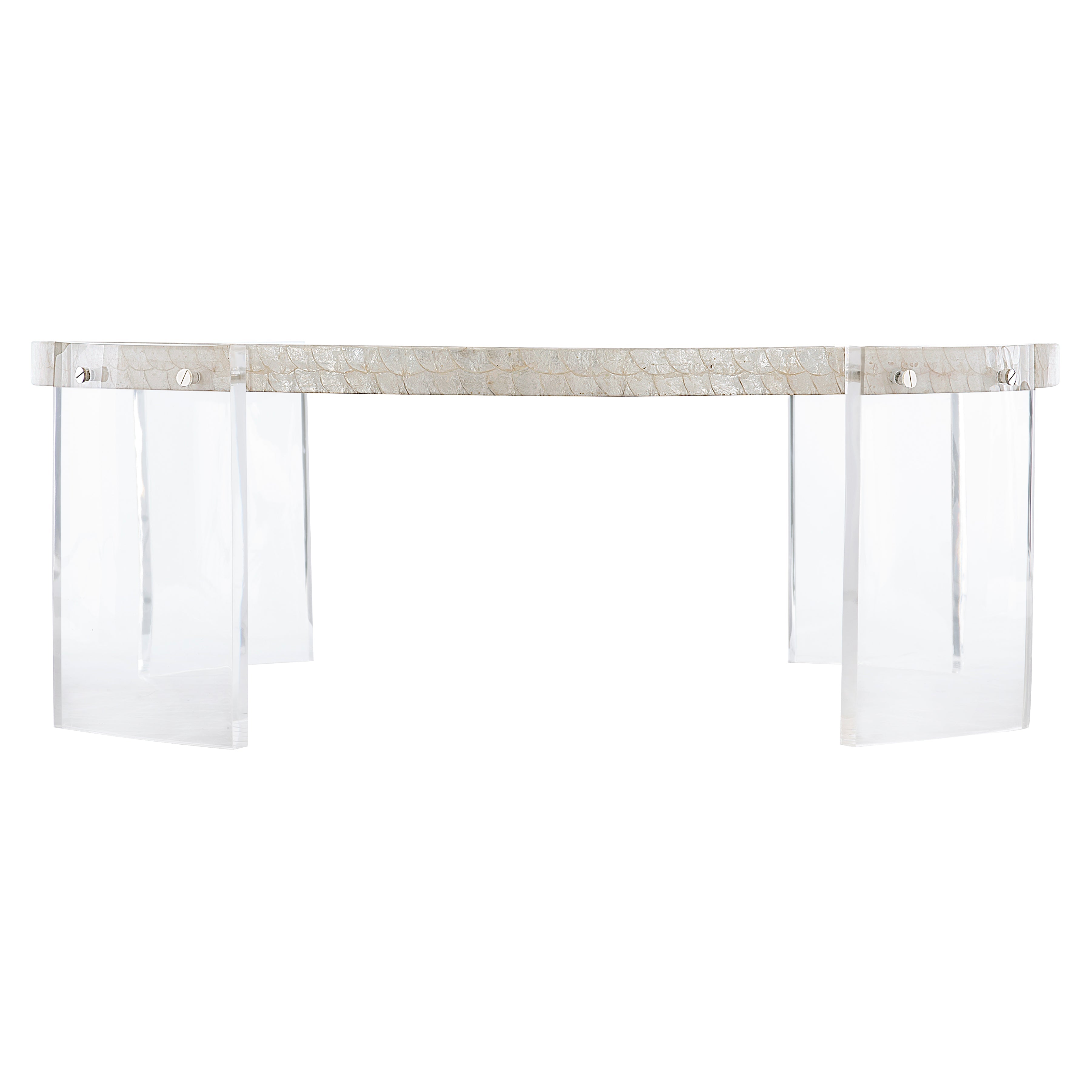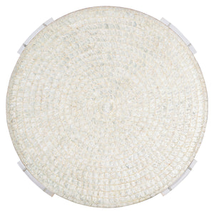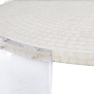 Round cocktail table.Capiz Shell top.Polylite top coat.Acrylic leg panels.