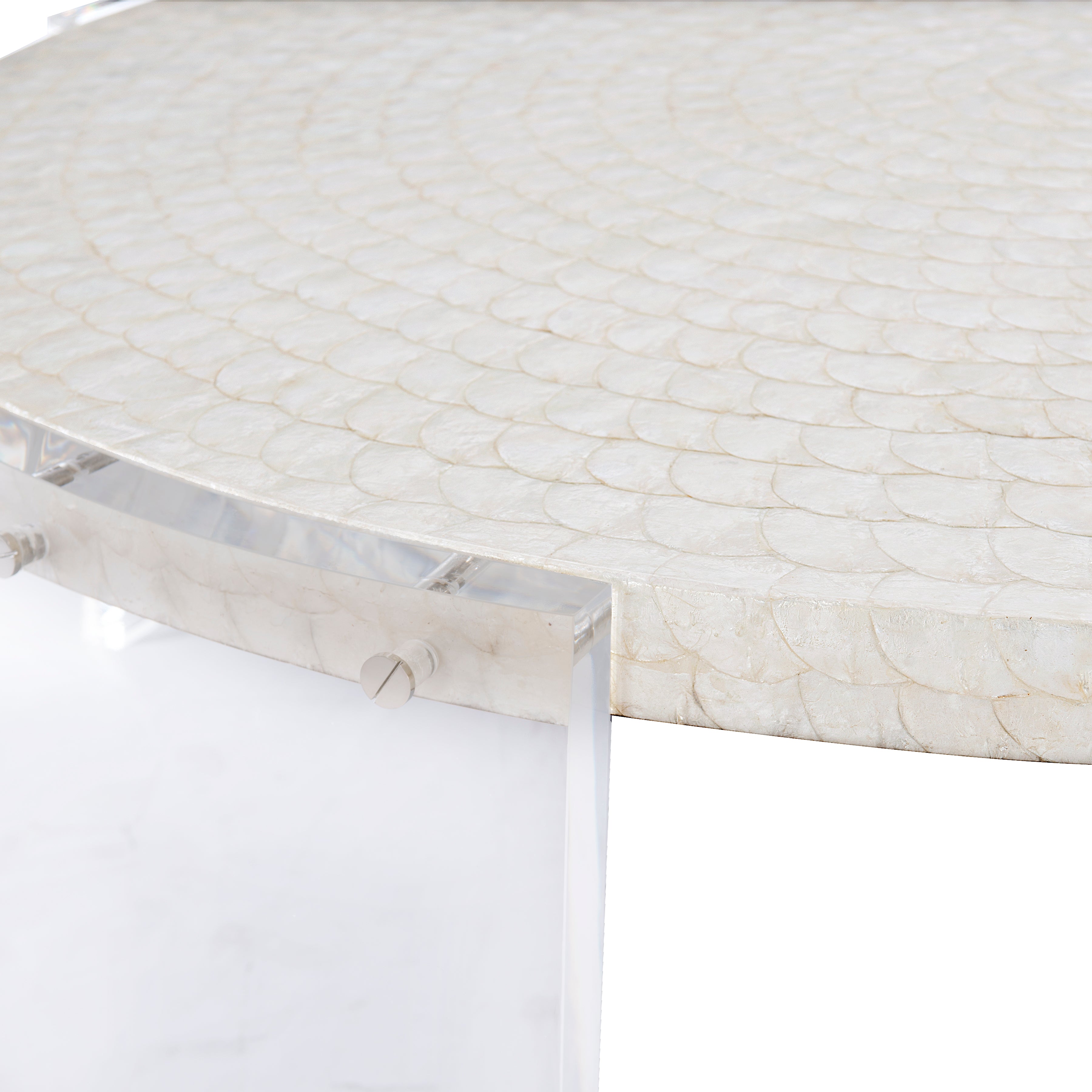Materials Capiz shell covered top, Acrylic legs, Nickel Plated bolts