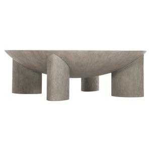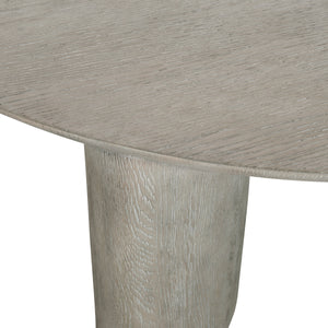 White oak veneered round top surface.Flint finish.Cast resin base with four oval-shaped legs.Adjustable glides.