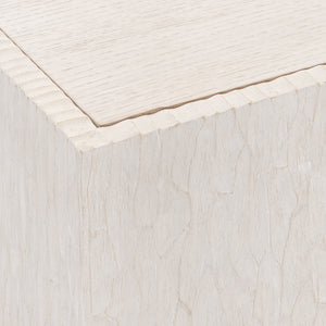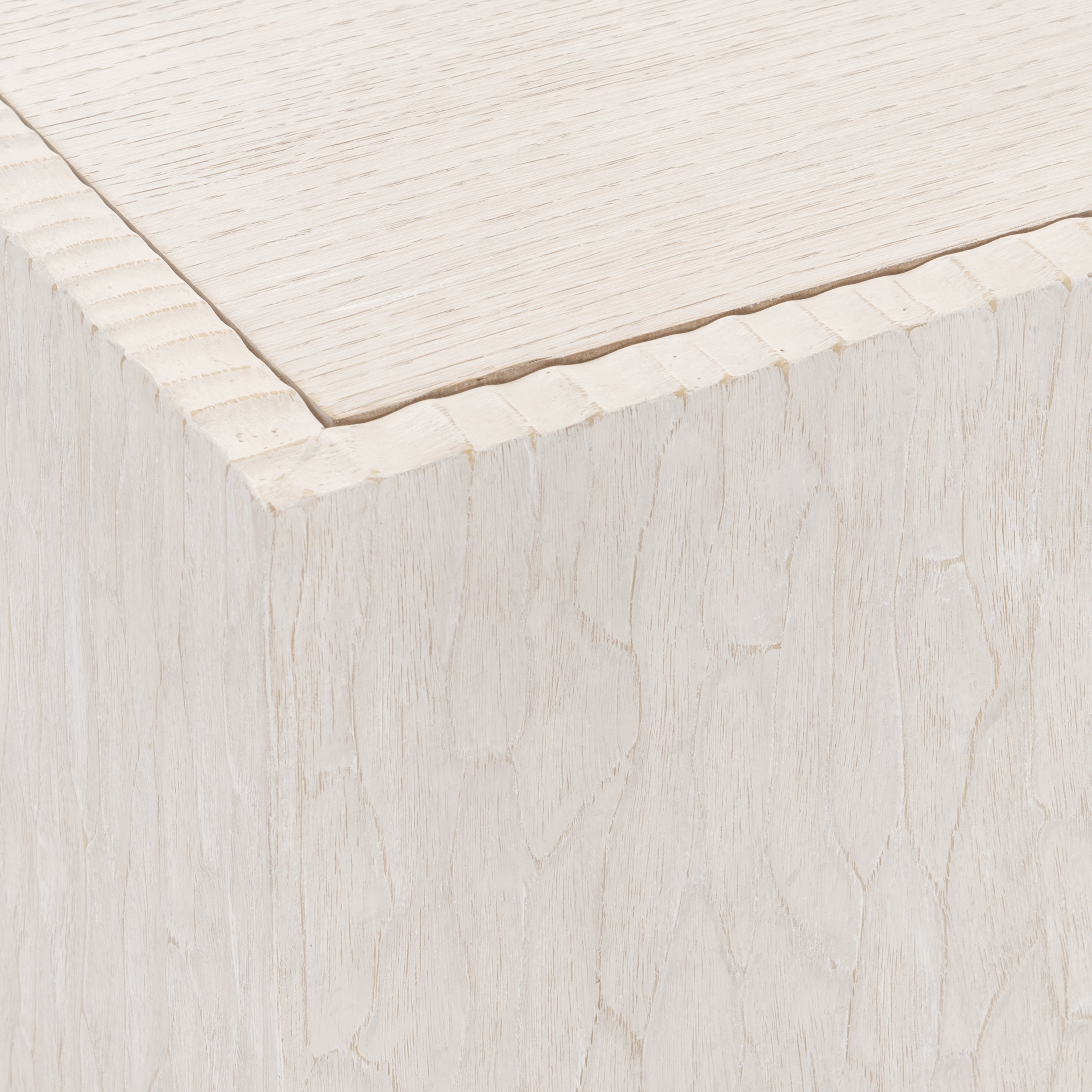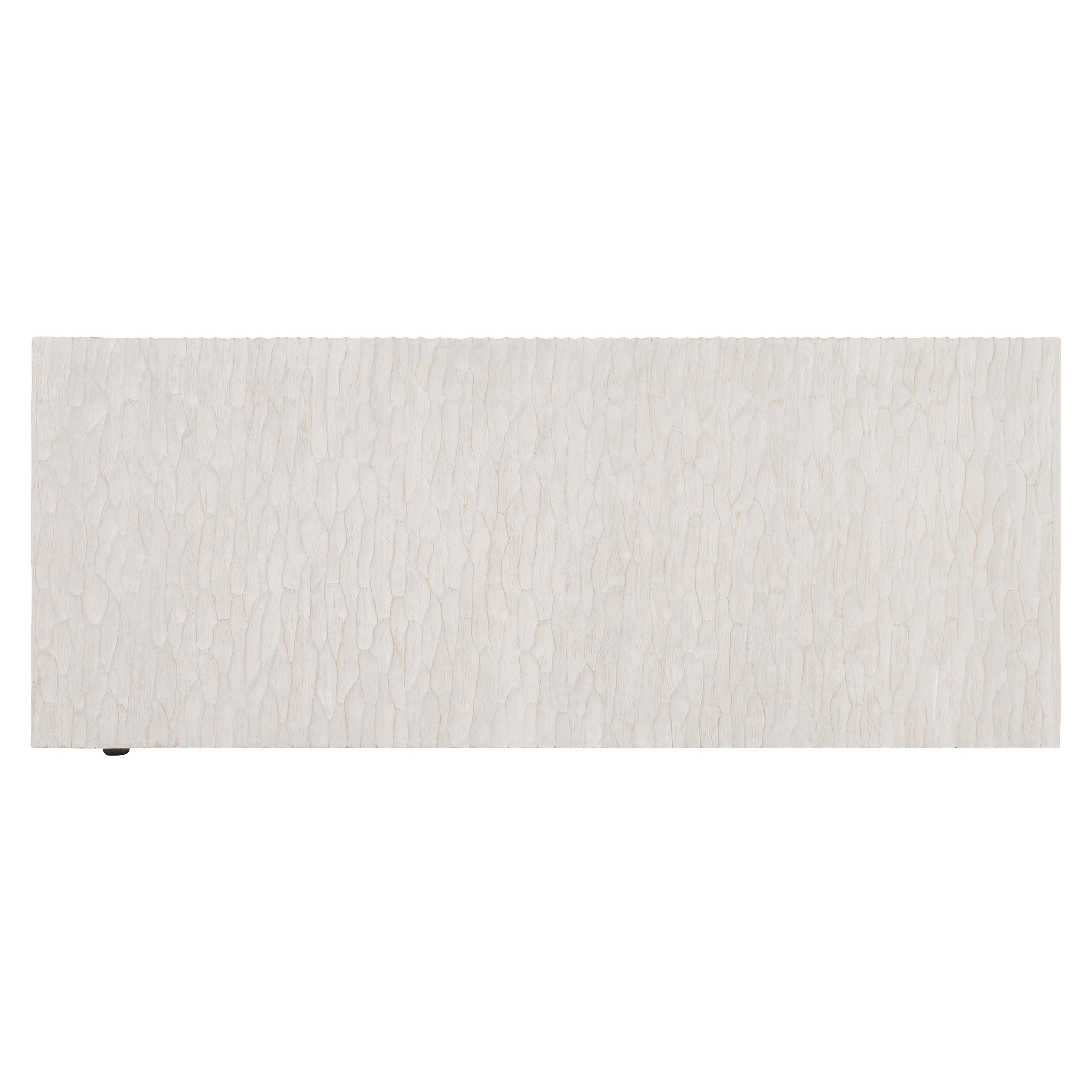 Inset wood top.Cast resin chiseled design over marine grade plywood on all sides.Weathered Bone finish.Concealed non-marring heavy-duty casters.