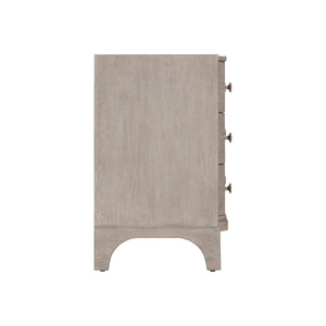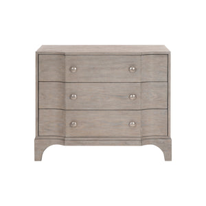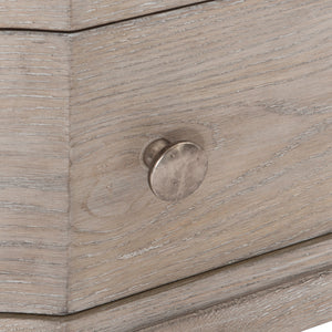 White oak solids and knotty white oak veneersPewter finish on breakfront nightstandThree soft-close drawersTwo-port USB charger on back of nightstandAdjustable glides & Anti-tip kit