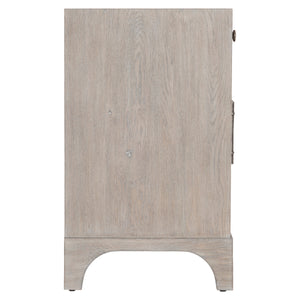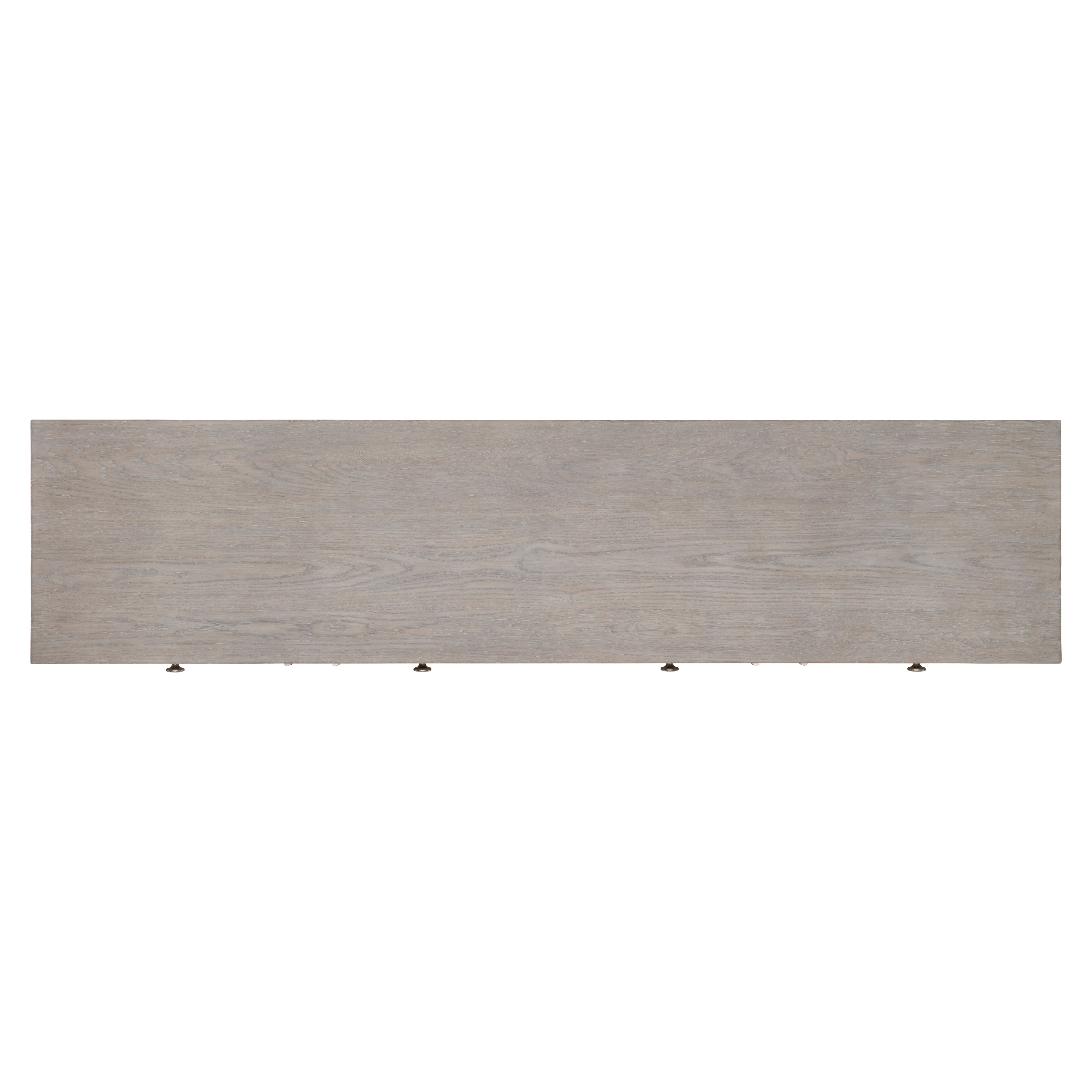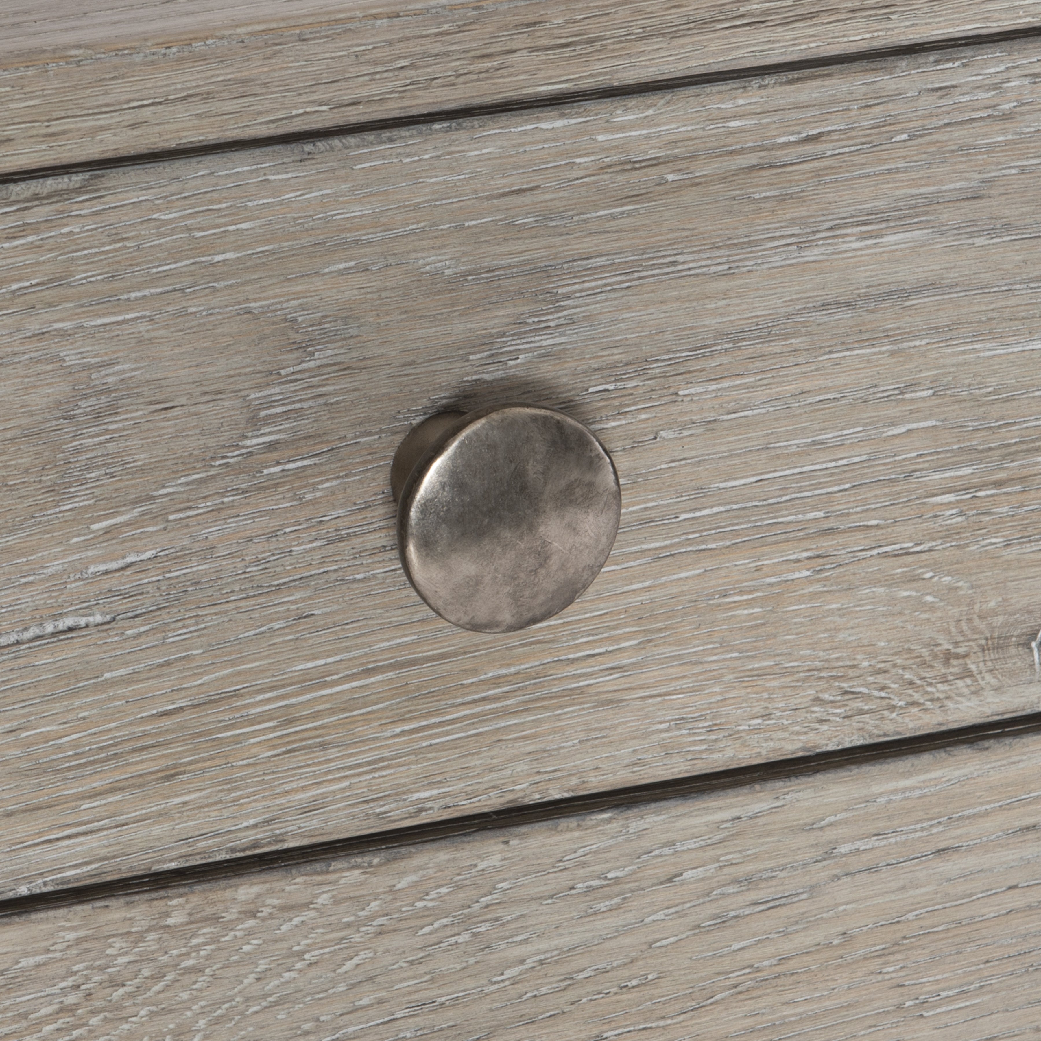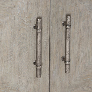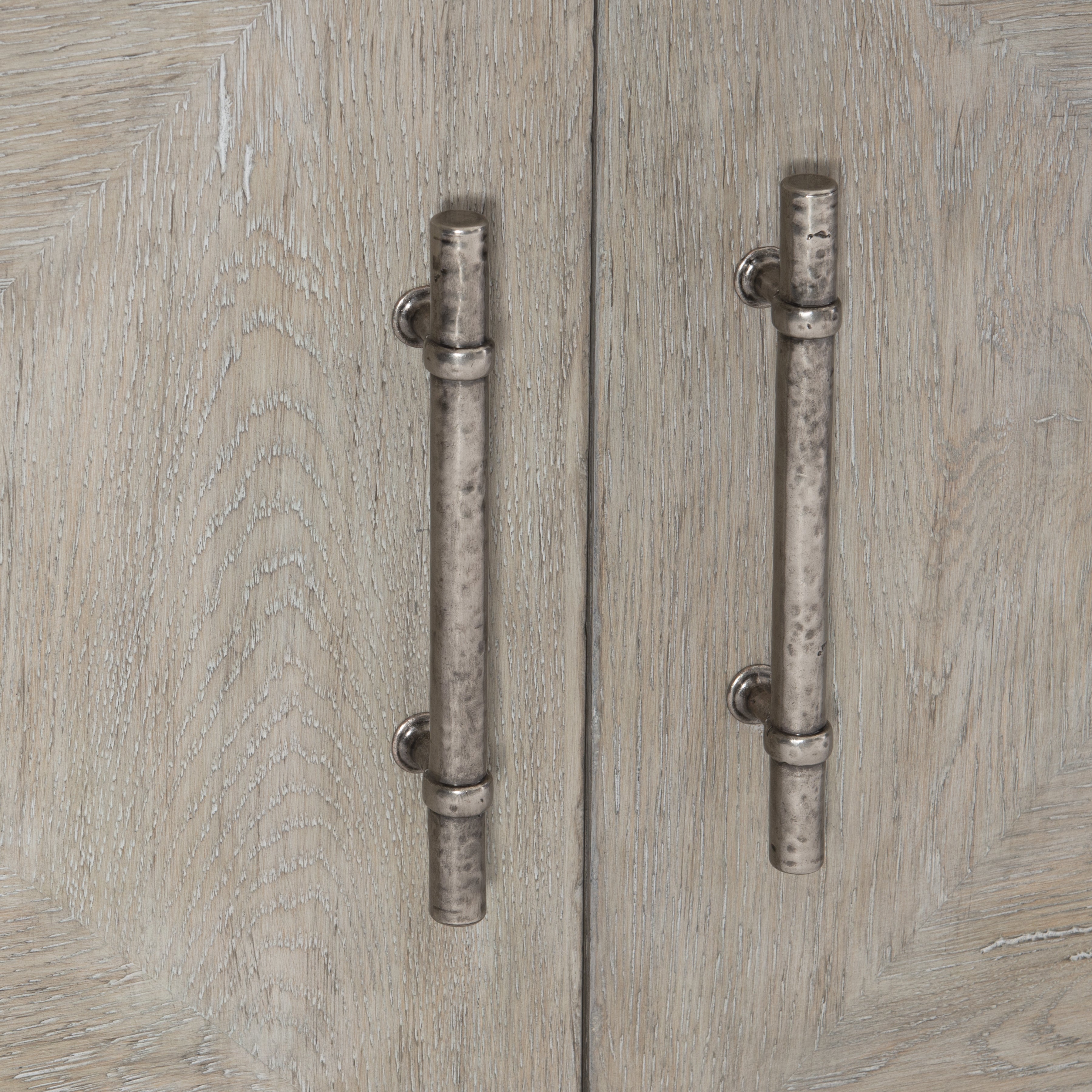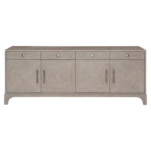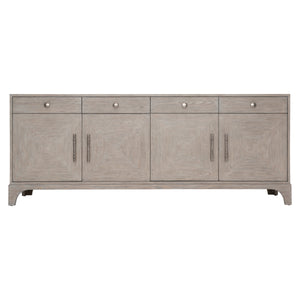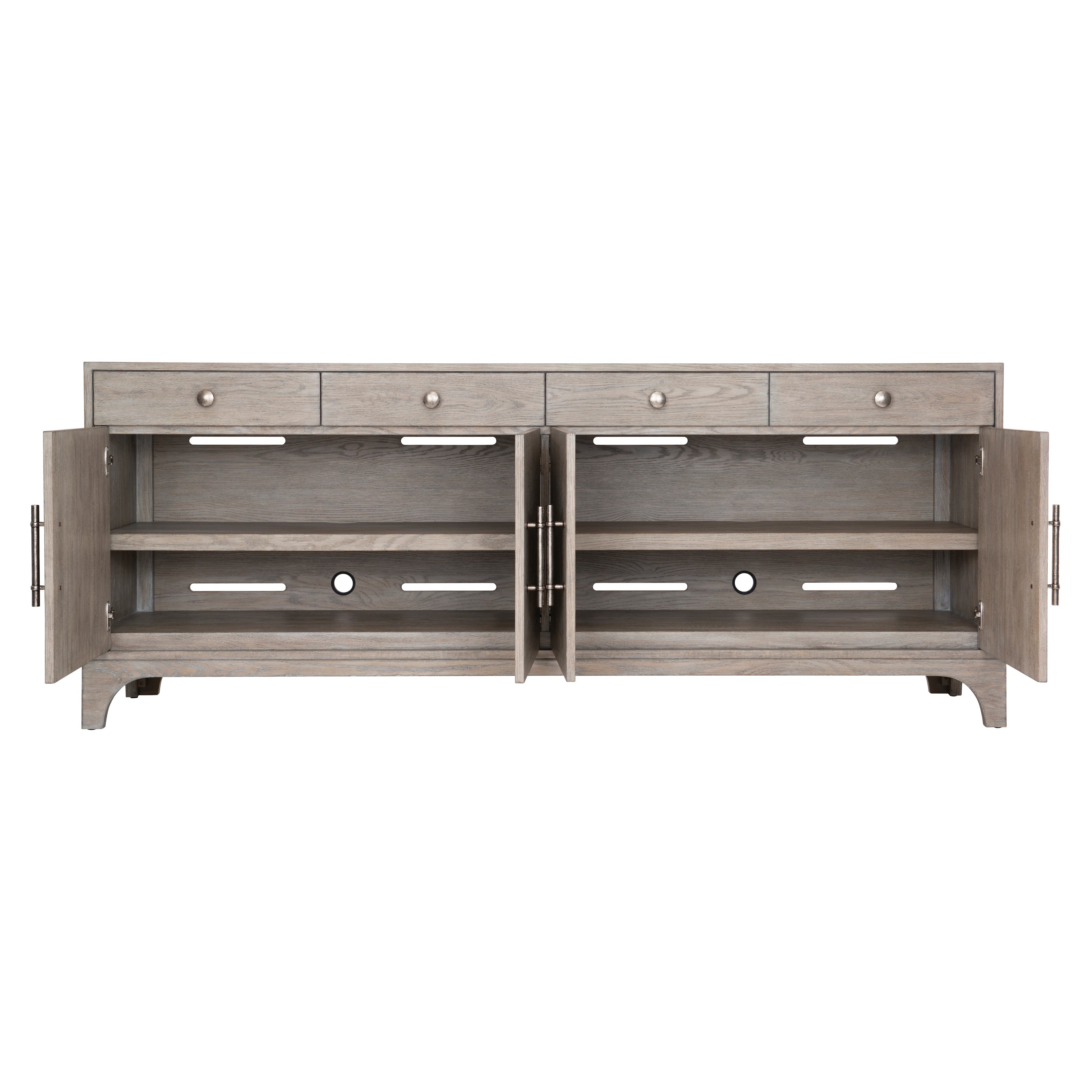 White oak solids and knotty white oak veneers with Pewter finish on credenzaFour drawers at the top and two pairs of concealed hinge fancy face soft-close doors below drawersBehind each pair of doors is one adjustable/removable shelf with vents and a covered grommet hole in the back panelAdjustable glidesAnti-tip kit