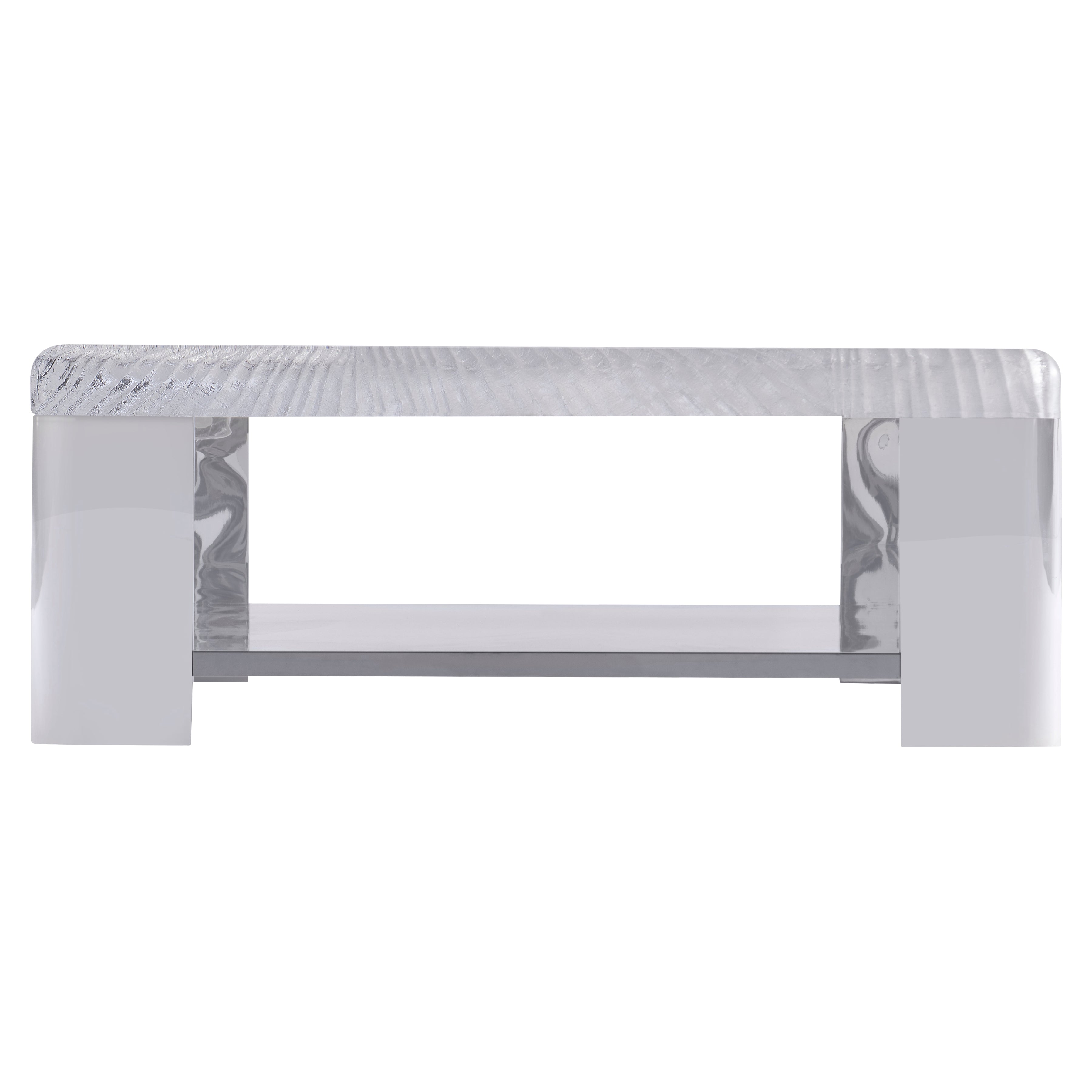 Patterned acrylic top, with smooth surface and pattern on undersidePolished Stainless Steel legsPolished Stainless Steel base shelfPattern reflects off stainless steel base shelfAdjustable glides