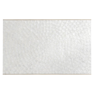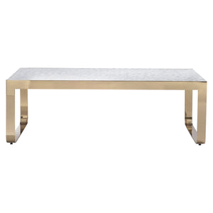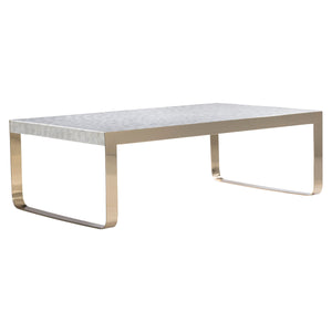 Rectangular cocktail tableTop and sides of top covered in Capiz shellBrass-plated stainless steel baseAdjustable glides