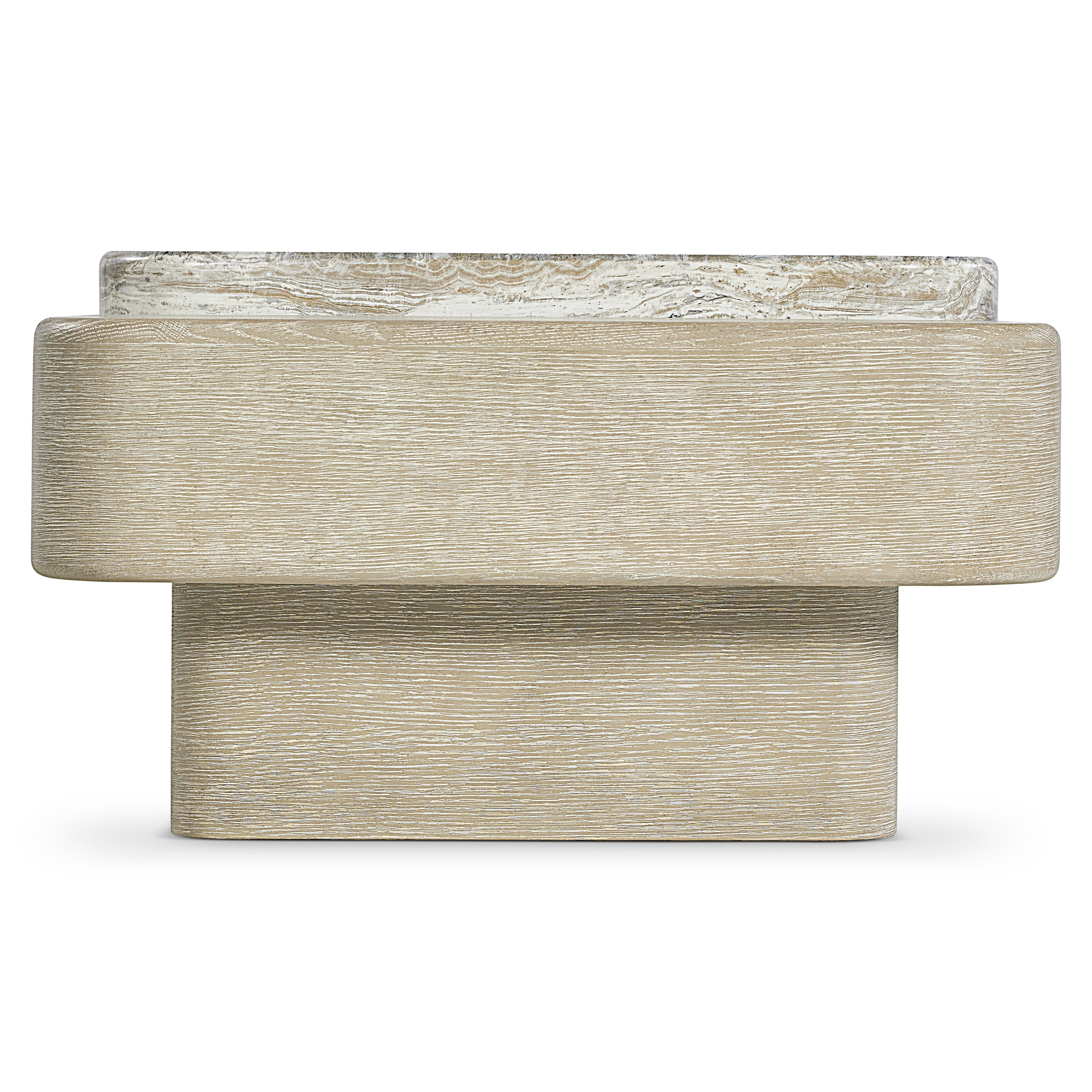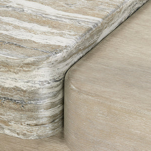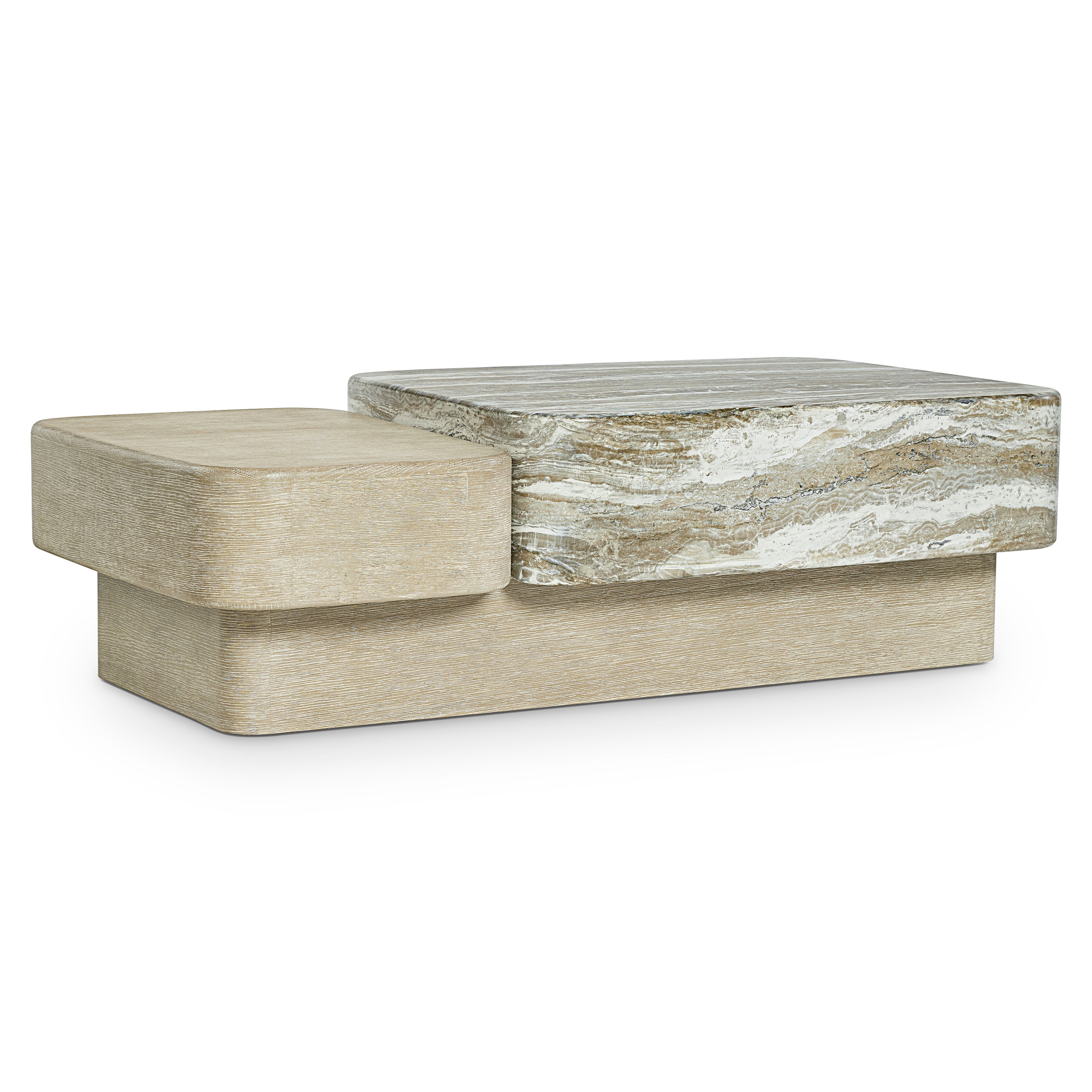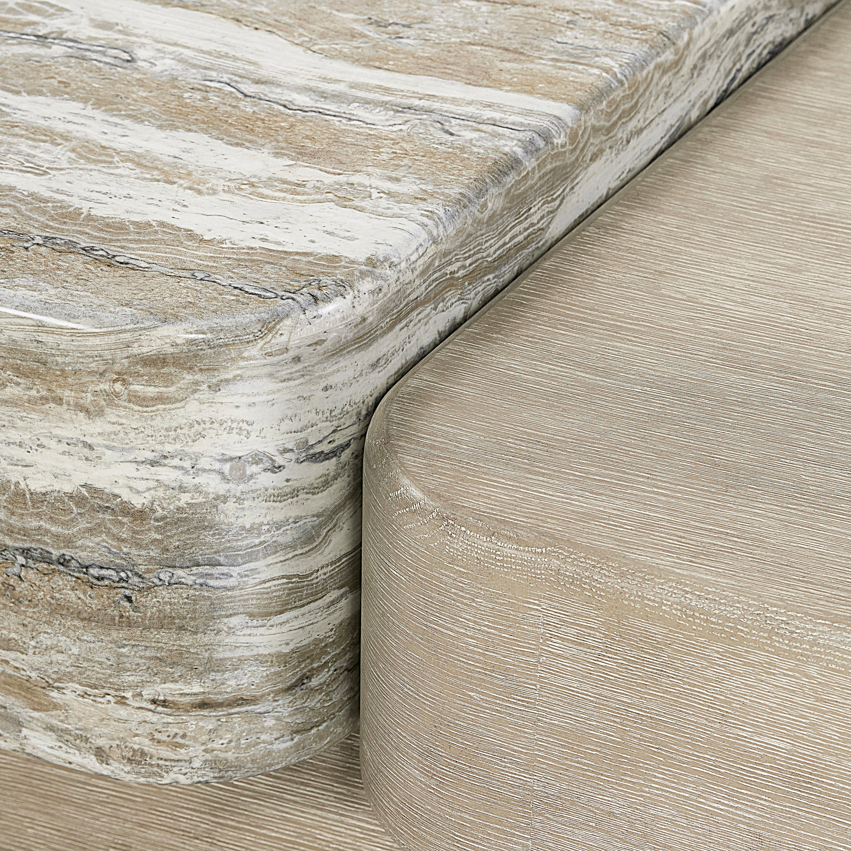 Base and smaller top of white oak solids and veneers in Clay finish with larger faux stone top in Kalta finishCastersSpecifications subject to change without notice