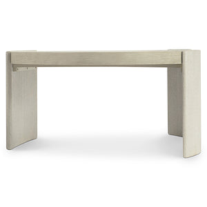 Table top of white oak solids and veneers in Clay finish atop raffia-wrapped legs in Silt finishAdjustable glidesSpecifications subject to change without notice