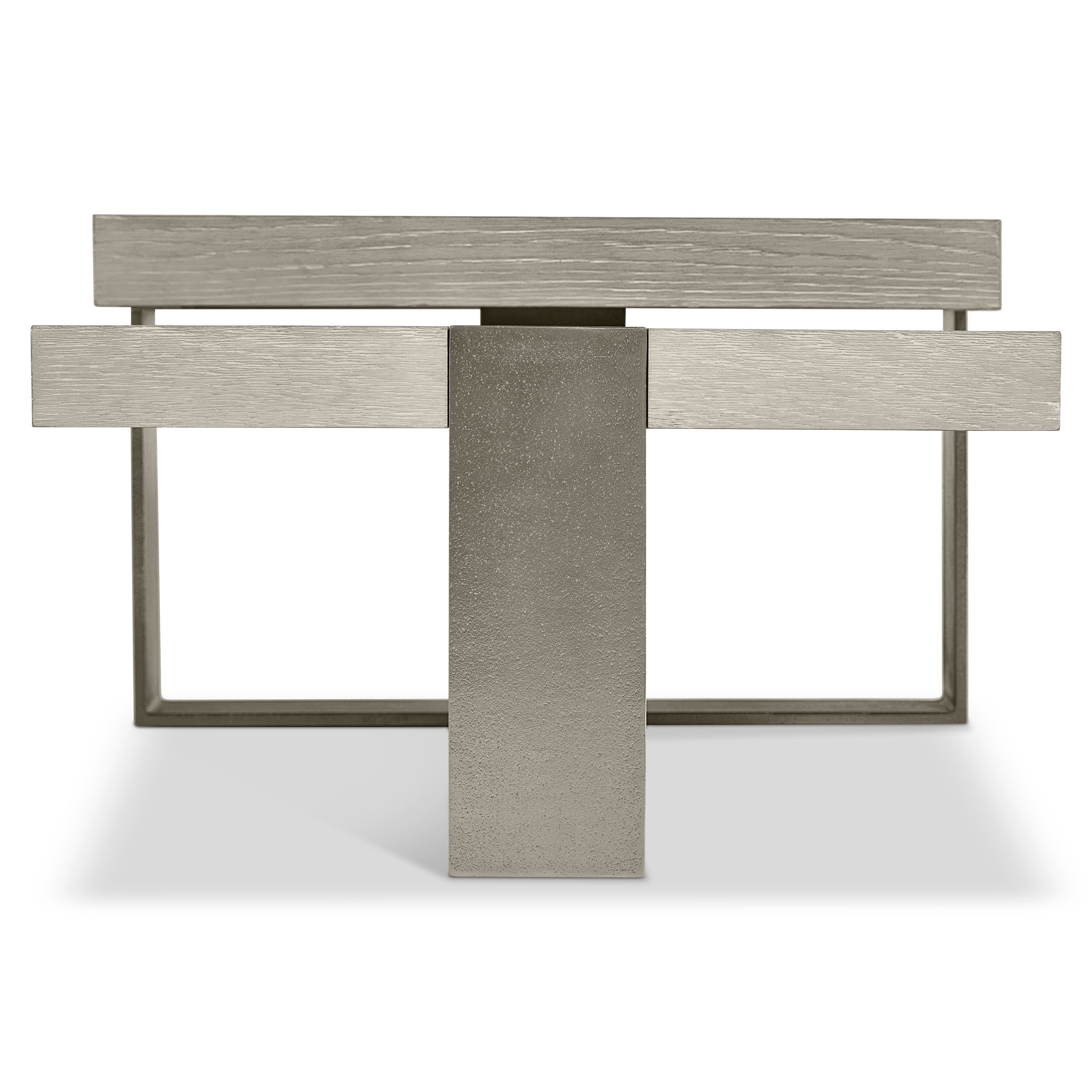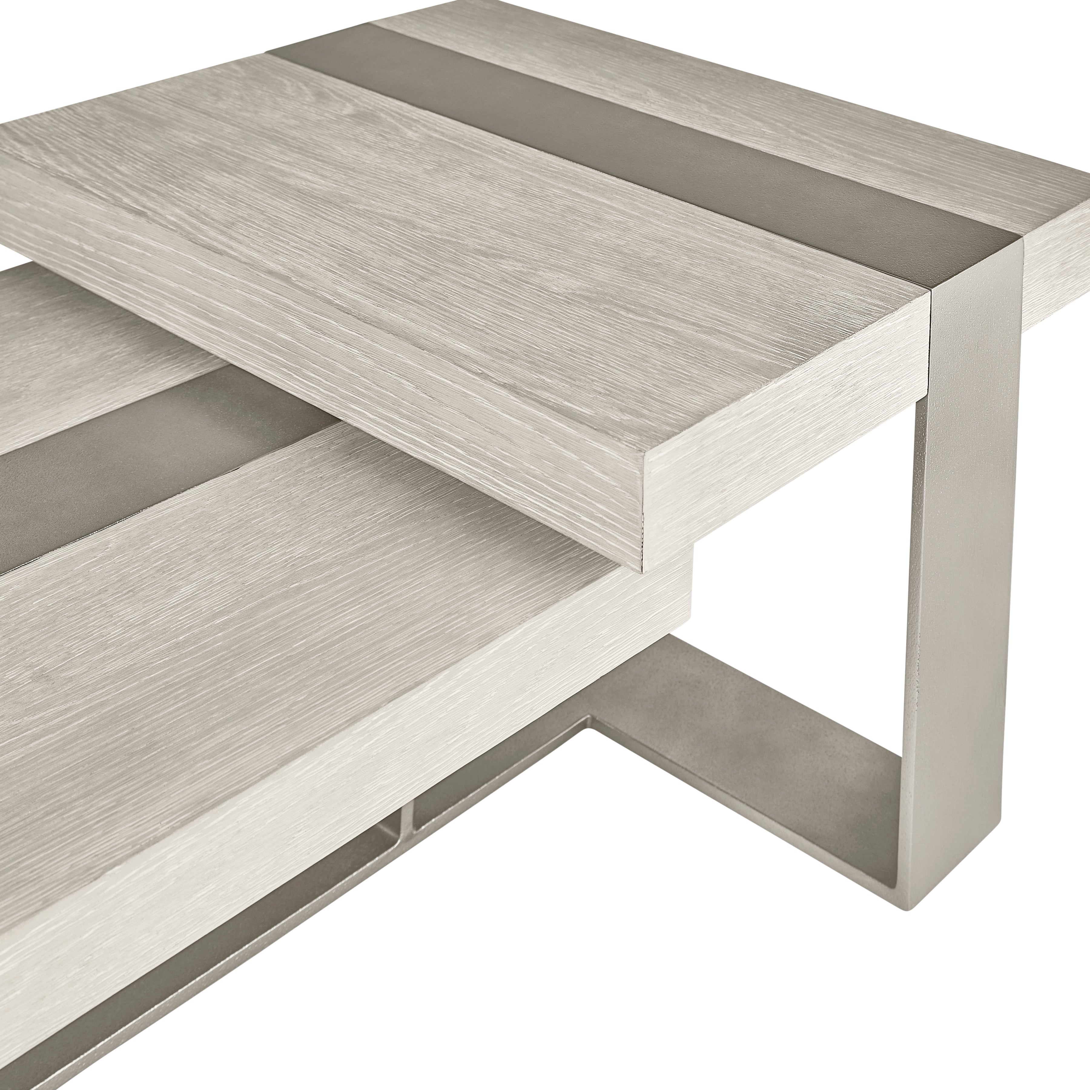 Multilevel, wirebrushed oak tops in Larza finishSandblasted aluminum base in Satin Nickel finishAdjustable glidesSpecifications subject to change without notice