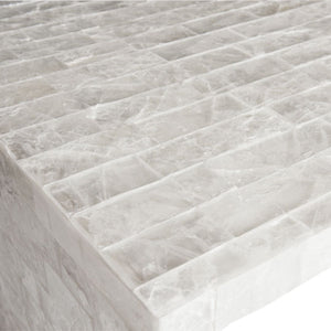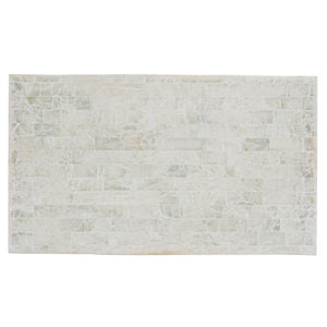 Rectangular cocktail table.Gypsum veneer with polyurethane coating.Steel plinth base in Pewter finish on bottom of sides.Adjustable glides.