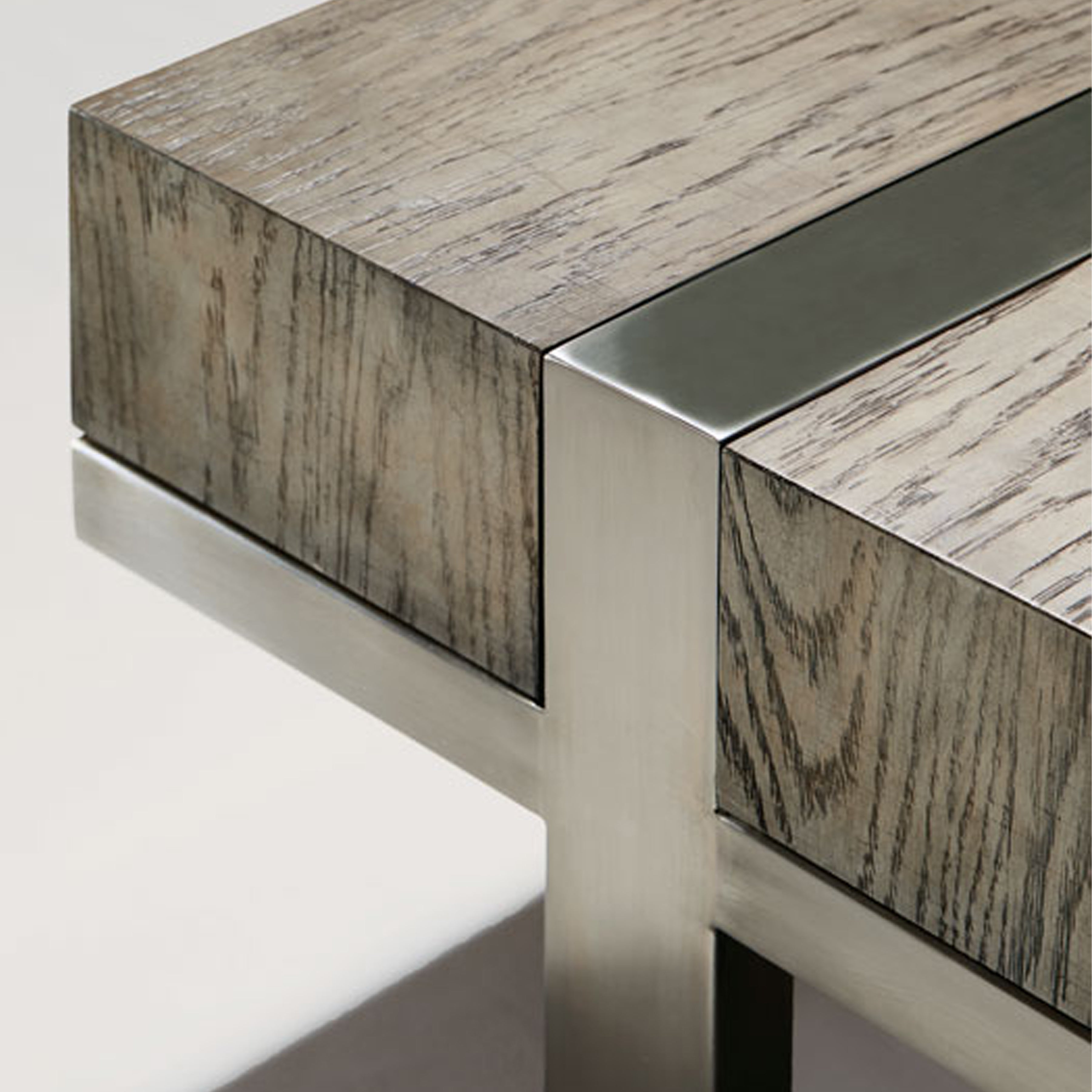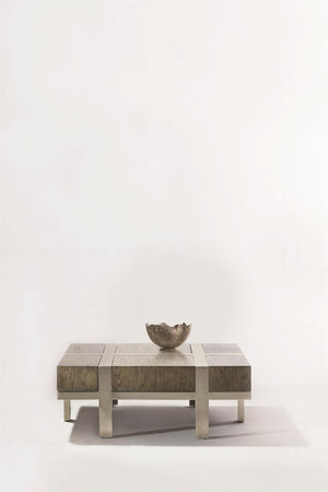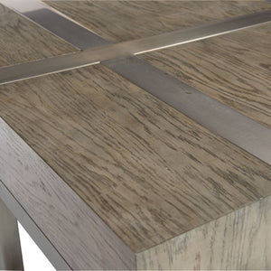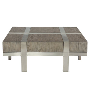 Square cocktail table.Inset wood panels in Rustic Gray finish.Tubular steel frame in Tarnished Nickel finish.Adjustable glides.