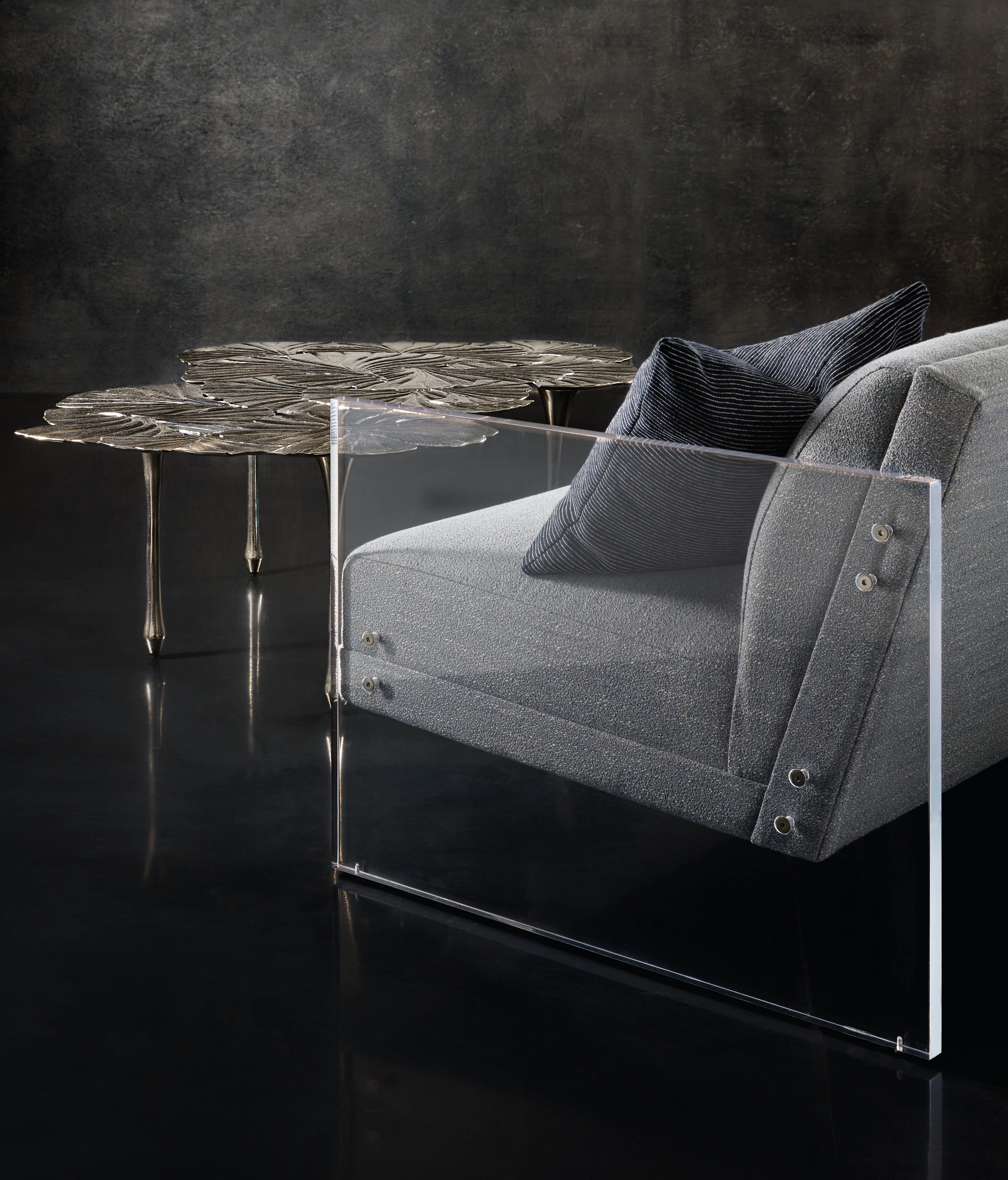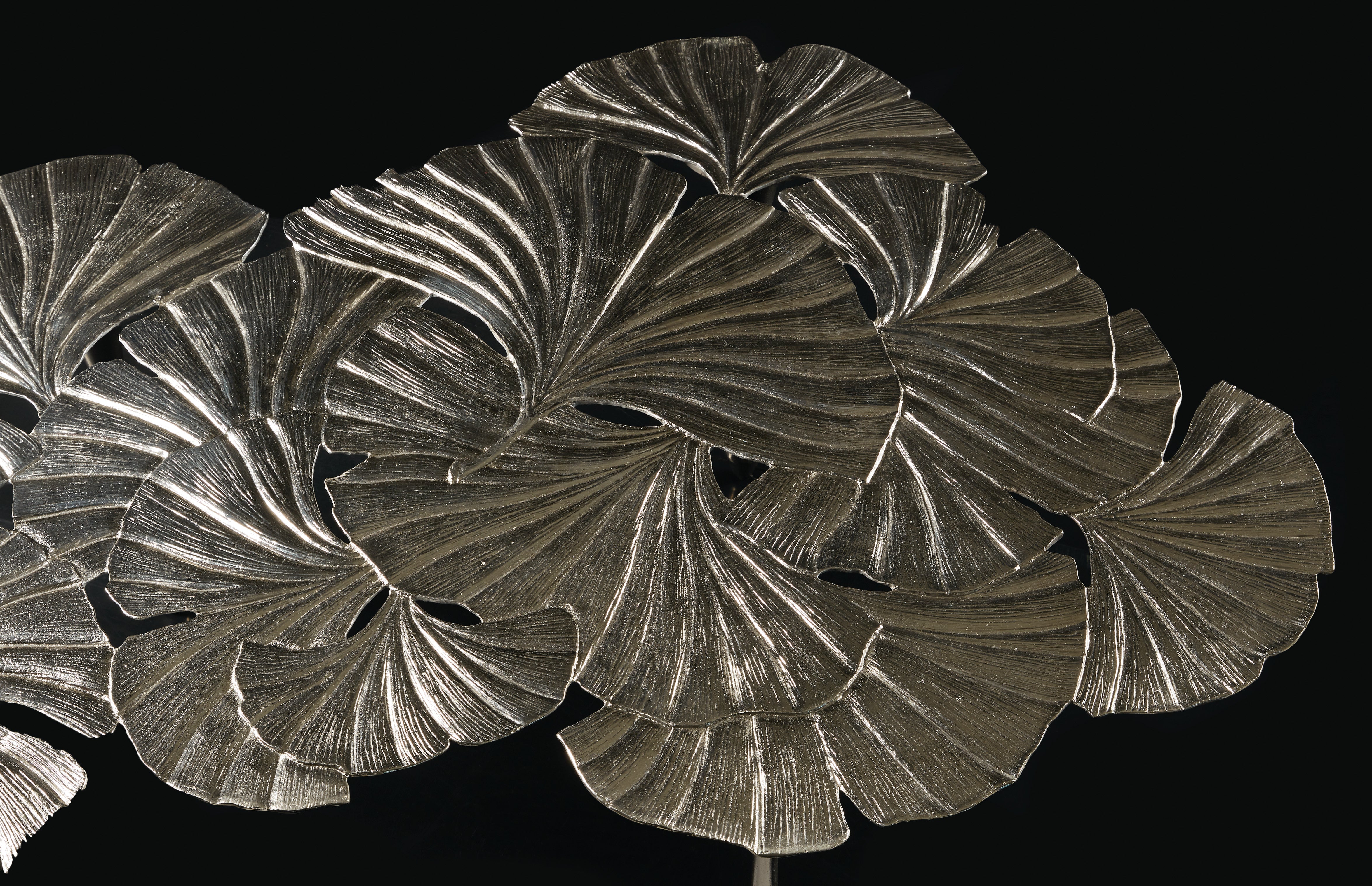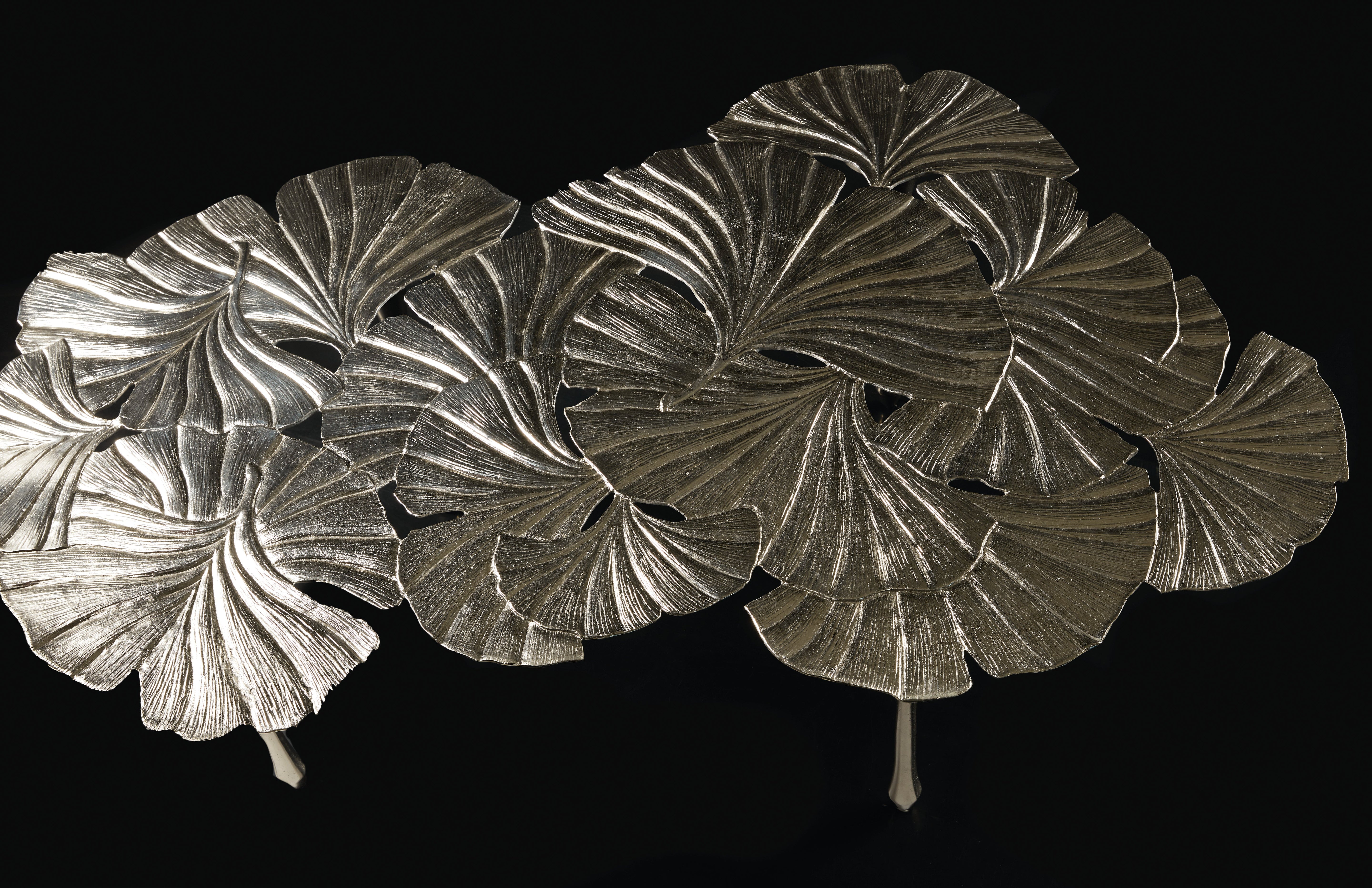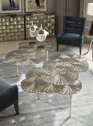 Cast aluminum cocktail table.Ginkgo leaf patterned top.Satin Nickel finish.Glides.
