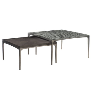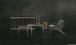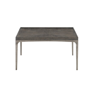 Fancy face wood top of white oak veneers.Cerused Charcoal finish.Solid and cast aluminum base in Textured Graphite finish.Black adjustable glides.