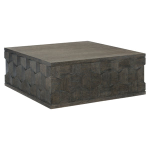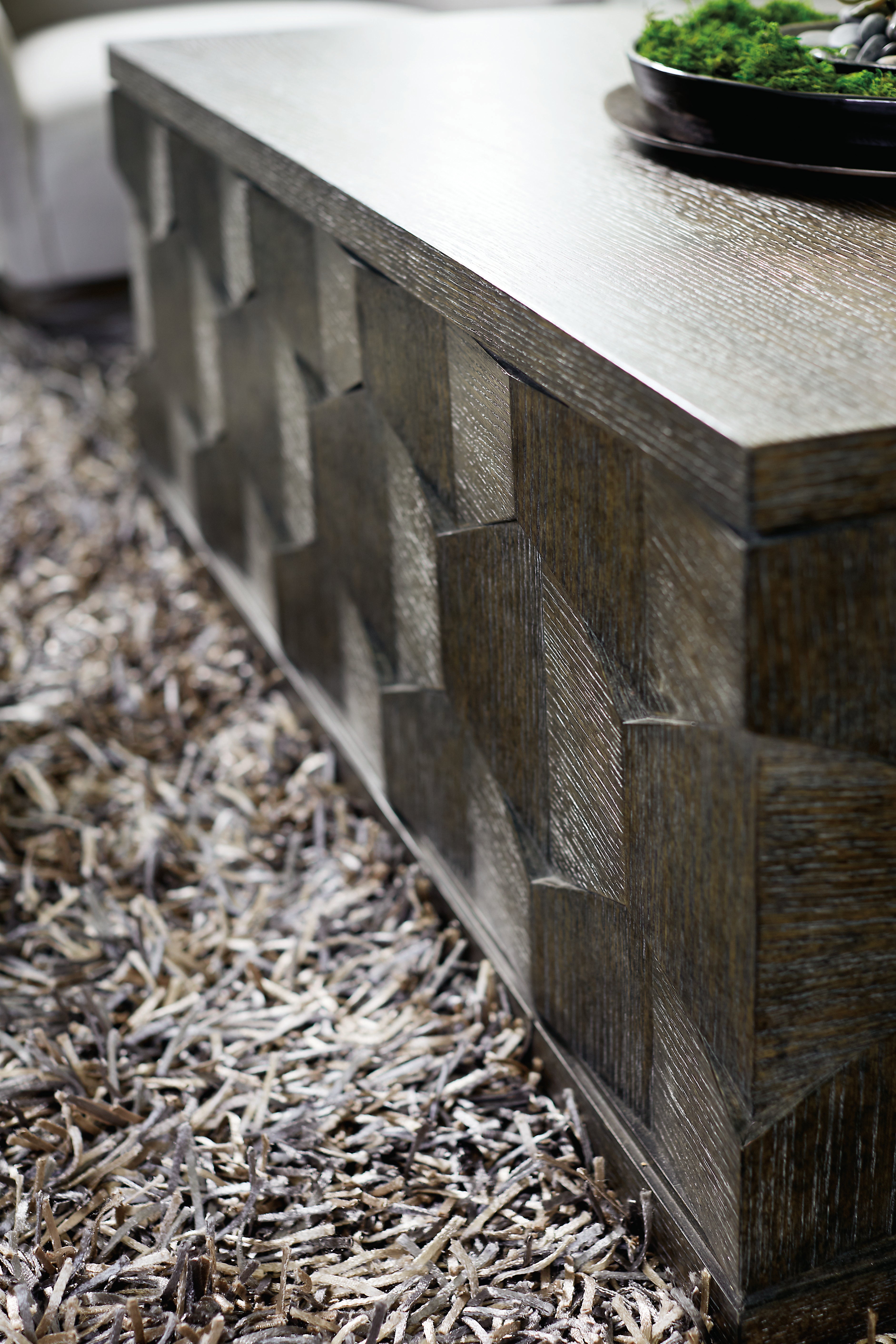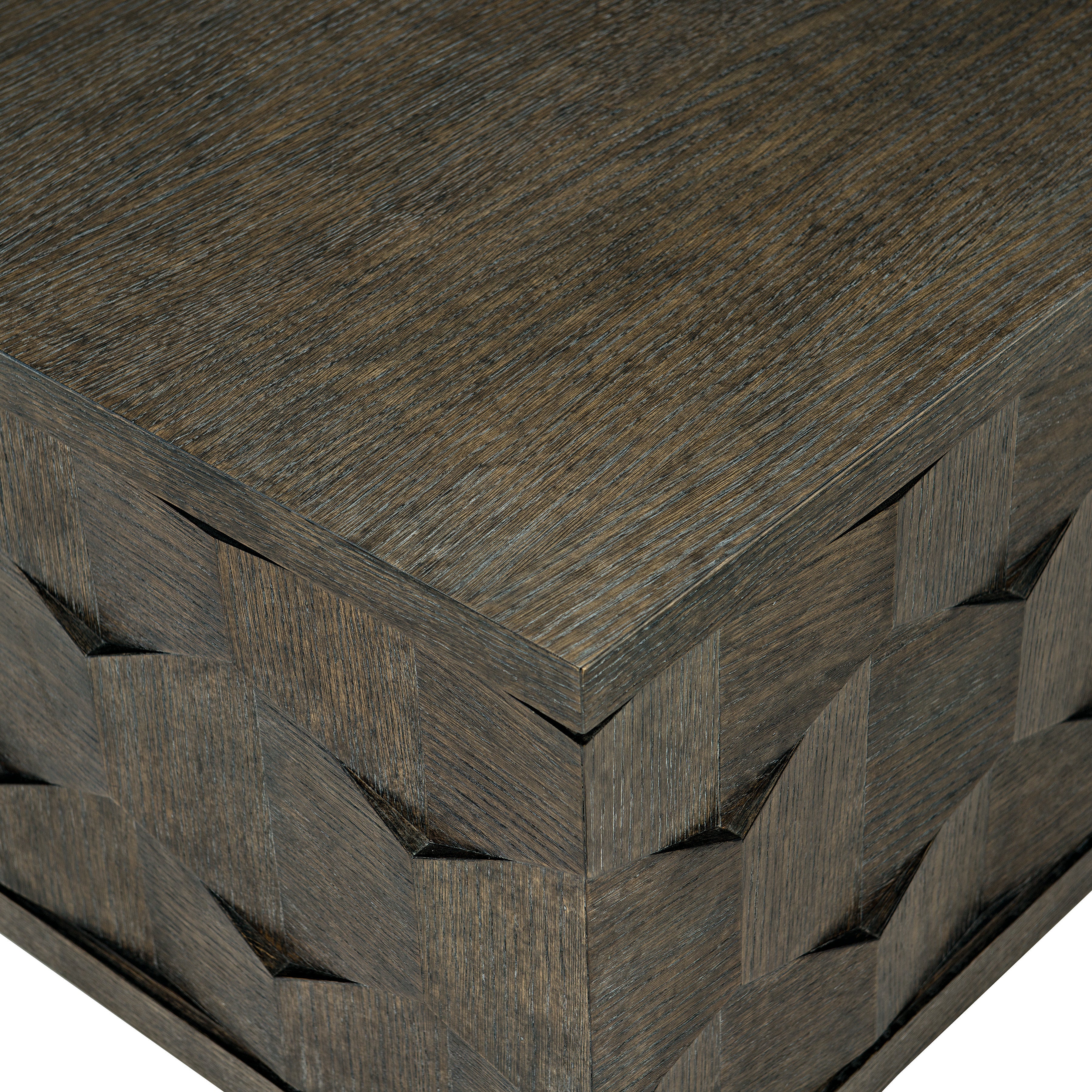 Wood cocktable with White Oak Veneers.Cerused Charcoal finish.Dimensional fancy face veneers on all sides.Casters.
