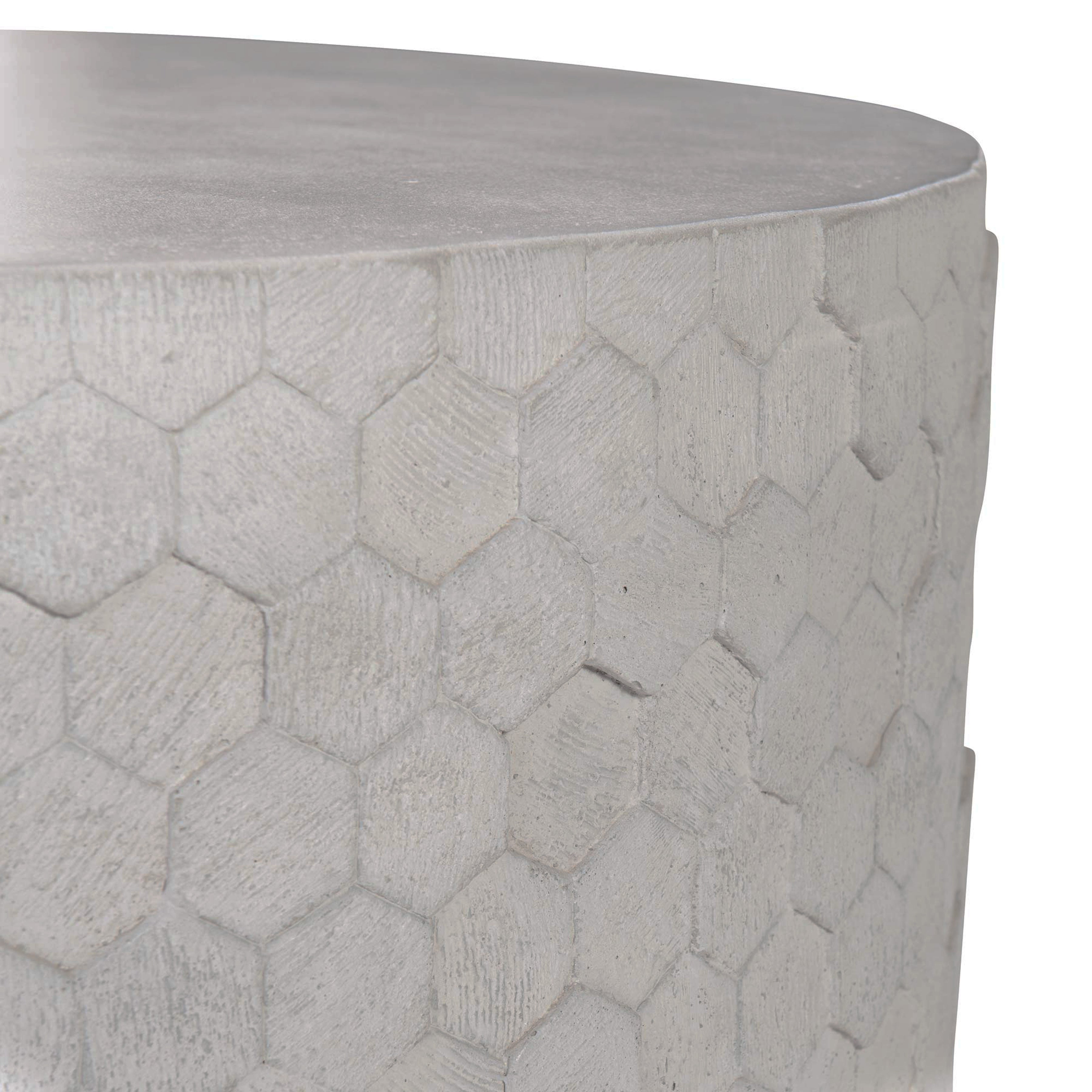 Round cocktail table.Natural concrete finish on cast concrete.Honeycomb pattern.Adjustable glides.