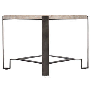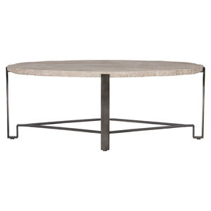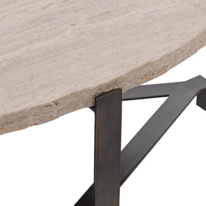 Oval shaped table.Laminated White Travertine stone top with chiseled edge.Solid steel base in oil-rubbed bronze finish.Adjustable glides.