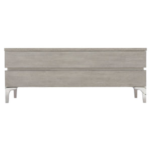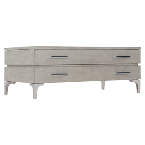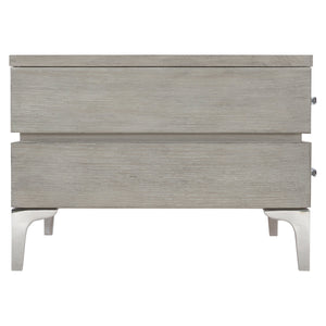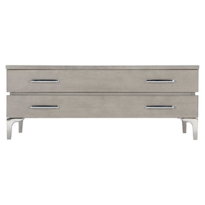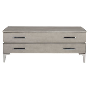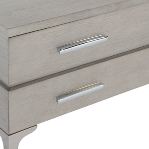 Oak solids and quartered oak veneers in Gray Truffle finish.Two drawers.Polished Bright Nickel feet.Adjustable glides.