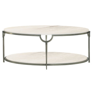 Faux Carrara marble top and shelf.Solid Steel frame in Oxidized Nickel finish.Stretchers.Adjustable glides.