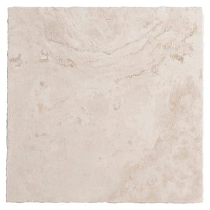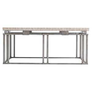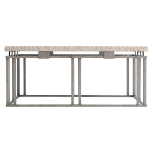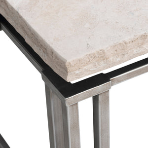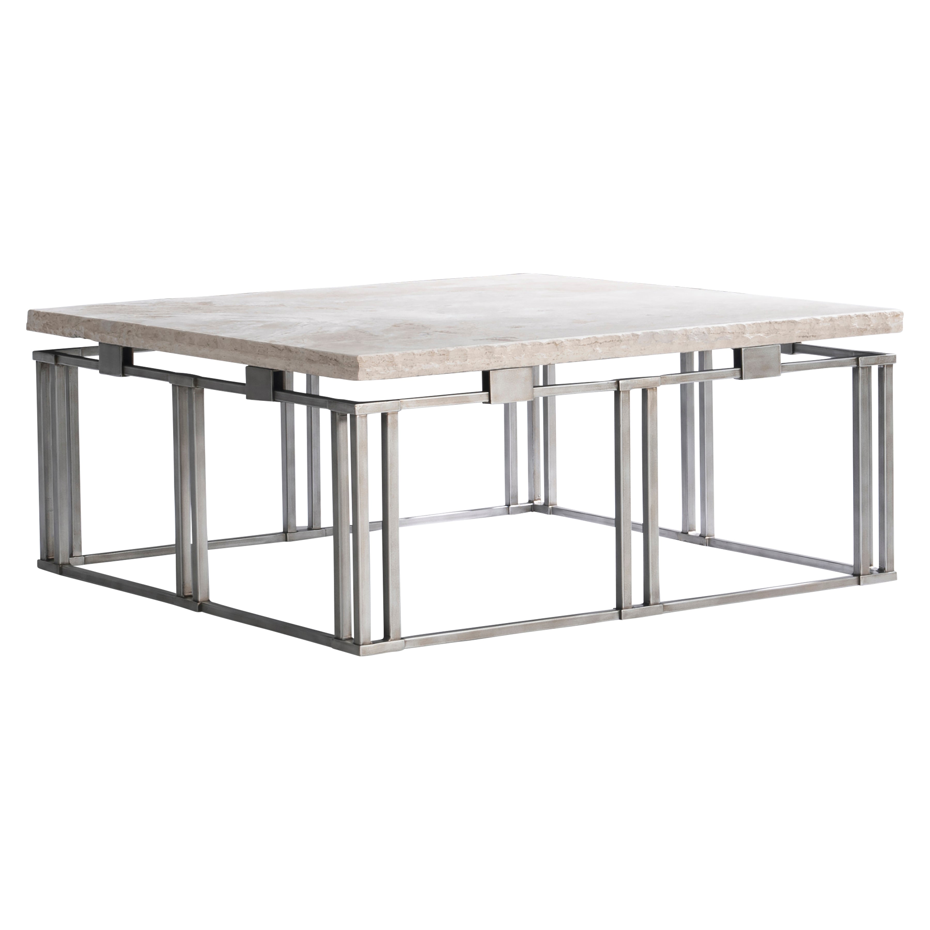 Square cocktail table.Honed Bianco Travertine laminated stone top with chiseled edges.Metal base in silver finish.Adjustable glides.