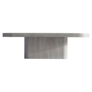 Rectangular fancy face wood top with metal inlay in Dark Graphite finishPedestal style baseCerused Greige finishAdjustable glides